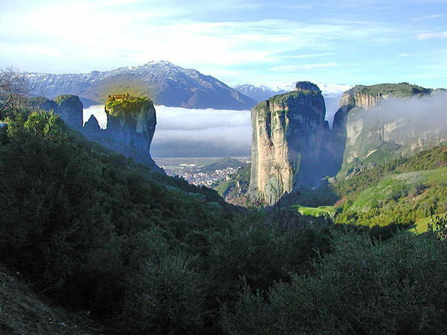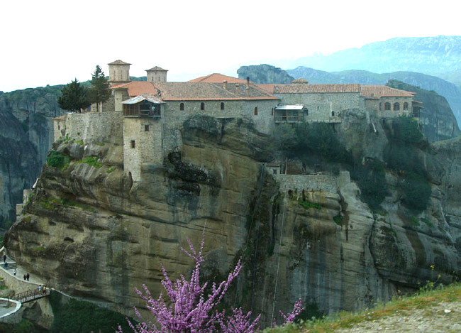 The Greek word Meteora means "suspended in the air", and our words meteorite and meteorology come from the same root. The conglomerate rock at Meteora, Greece, has eroded into fantastic peaks upon which medieval monks built monasteries, several of which are still active. The isolated monasteries of Meteora helped keep alive Greek Orthodox religious traditions and Hellenic culture during the turbulent Middle Ages and Ottoman Turk occupation of Greece (1453-1829). In 1988, UNESCO declared Meteora to be a World Heritage Site.